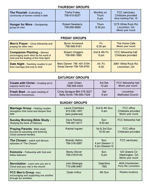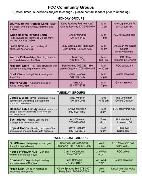 Groups are an integral part of being the church at Faith Community. As we experience life together in the awareness of the presence of God, we are formed into Christ-likeness and unified as one body by the Holy Spirit. Not only is this beneficial for our own spiritual lives, but it serves as a witness to the watching world of the reality of God's life changing power. Below is a list of all of our community groups that meet during the week. We are so grateful for community!